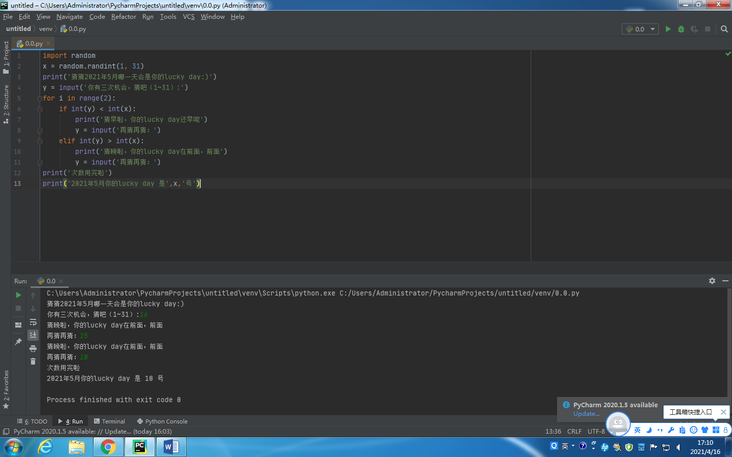 print('猜猜2021年5月哪一天会是你的lucky day:)')