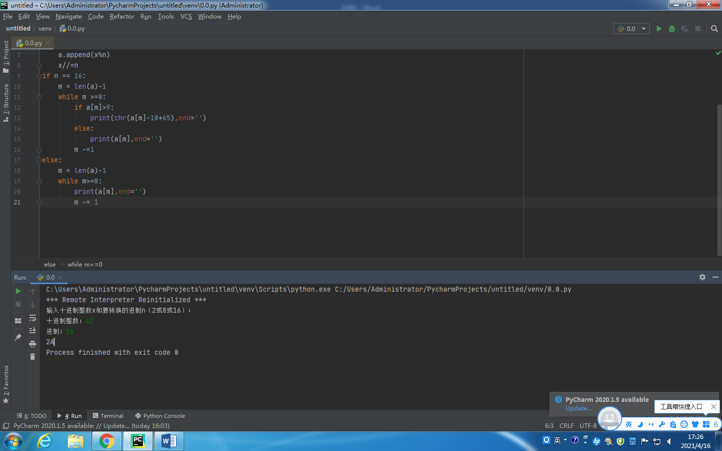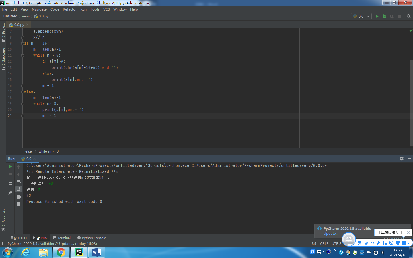 print('输入十进制整数x和要转换的进制n(2或8或16):')