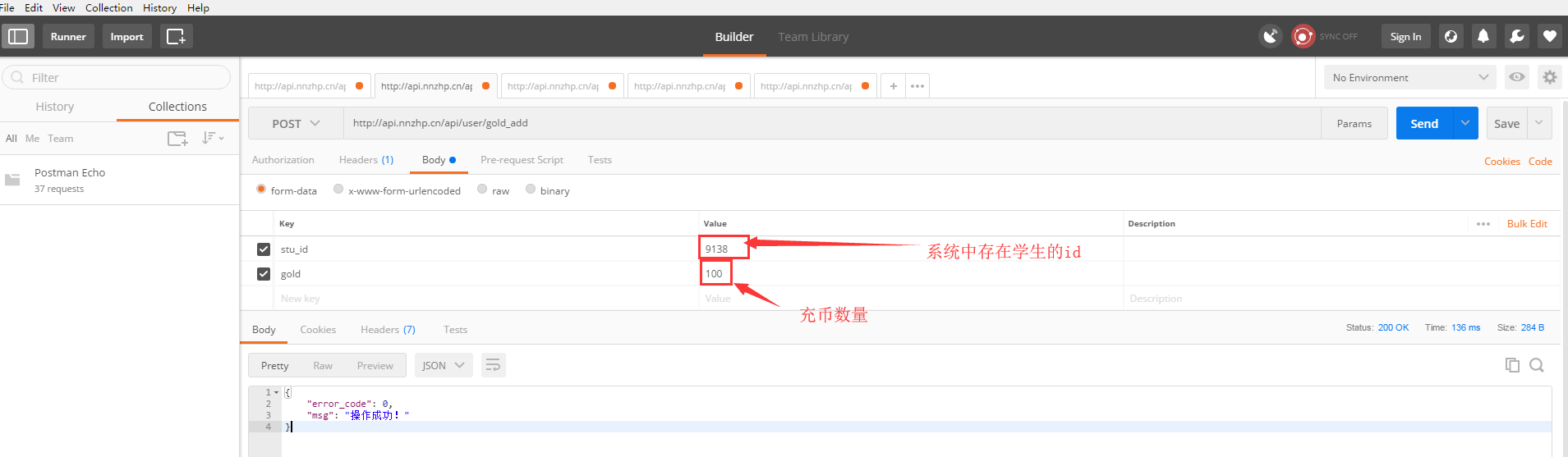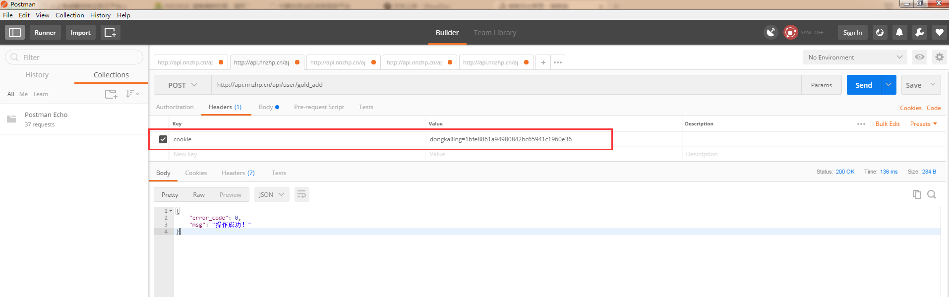 4、post请求如果要用到cookie的操作方法,比如学生冲金币,body里面输入字段,headers里面输入cookie,cookie值是用户名=密码,这个密码是从登录里面获取的
