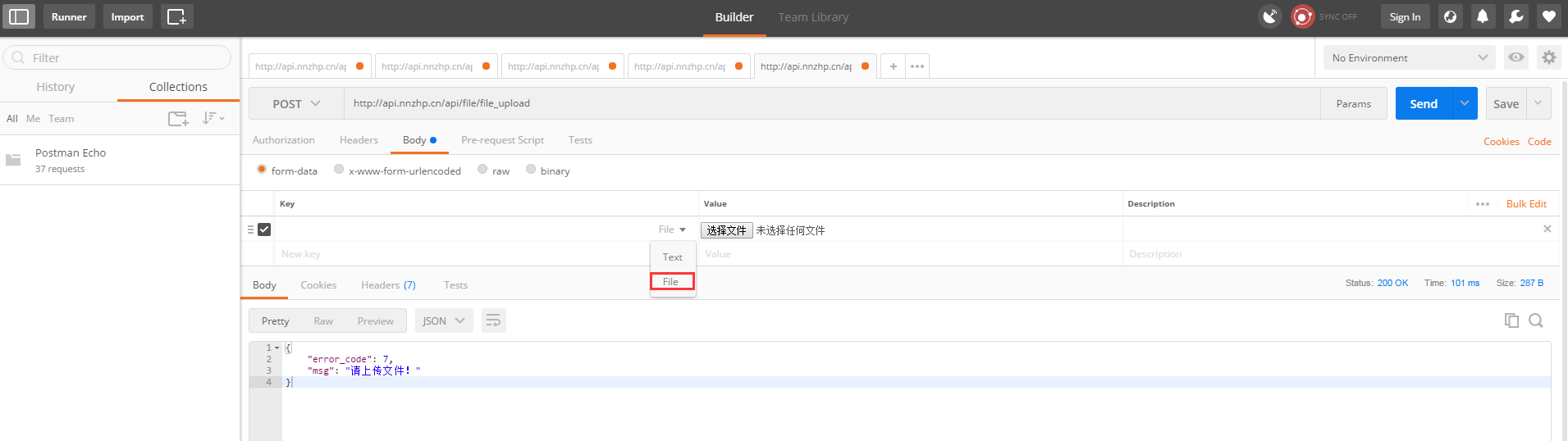 5、如何上传文件:body里面选择file,key里面输入file,然后点上传按钮