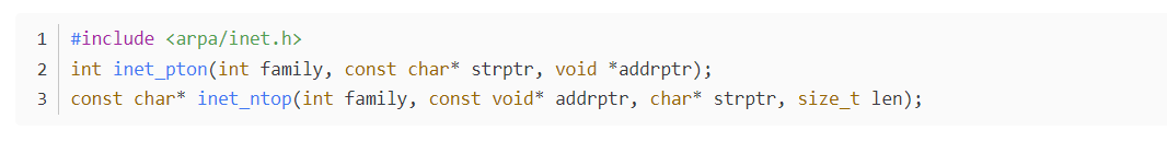 inet_pton尝试转换strptr所指字符串,并将二进制结果存放在addrptr中,成功返回1,失败返回0.