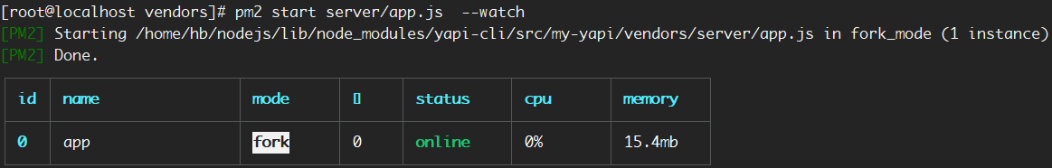 --全局安装命令 npm install -g pm2 安装好之后,进入目录 cd {install_path}/nodejs/lib/node_modules/yapi-cli/src/my-yapi/vendors/ 运行命令: pm2 start server/app.js --watch 此时,可能会出现 “未找到命令”或“command not found”的错误,这时,回到我们安装pm2完成时,在控制台会输出几个路径地址,找到 {install_path}/nodejs/bin/pm2 -> {install_path}/nodejs/lib/node_modules/pm2/bin/pm2