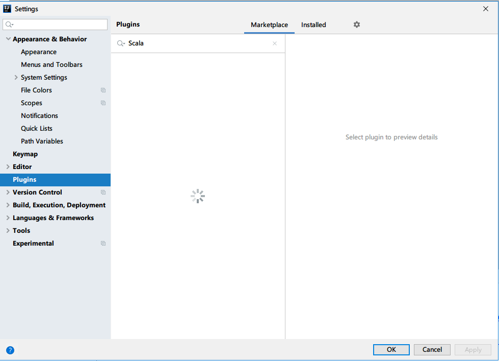 按照其他博友的操作,有的方法在我配置的时候没有行得通,我在这里直接搜索Scala会很慢,而且最后告诉我没有该插件,我想应该是有其他方法,最后我采用了Install Plugin from Disk的方式进行了安装
