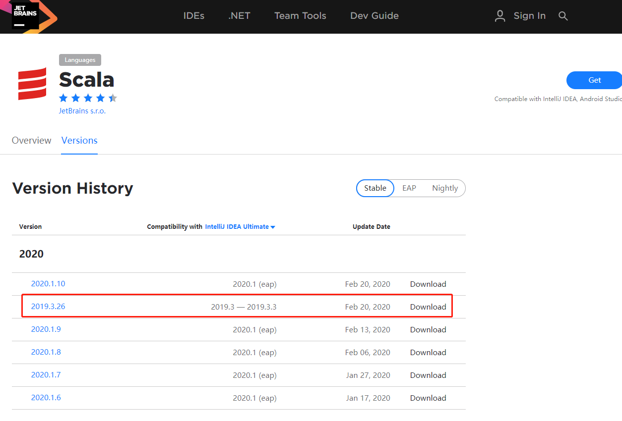 首先去 IDEA官方下载Scala插件:https://plugins.jetbrains.com/plugin/1347-scala/versions