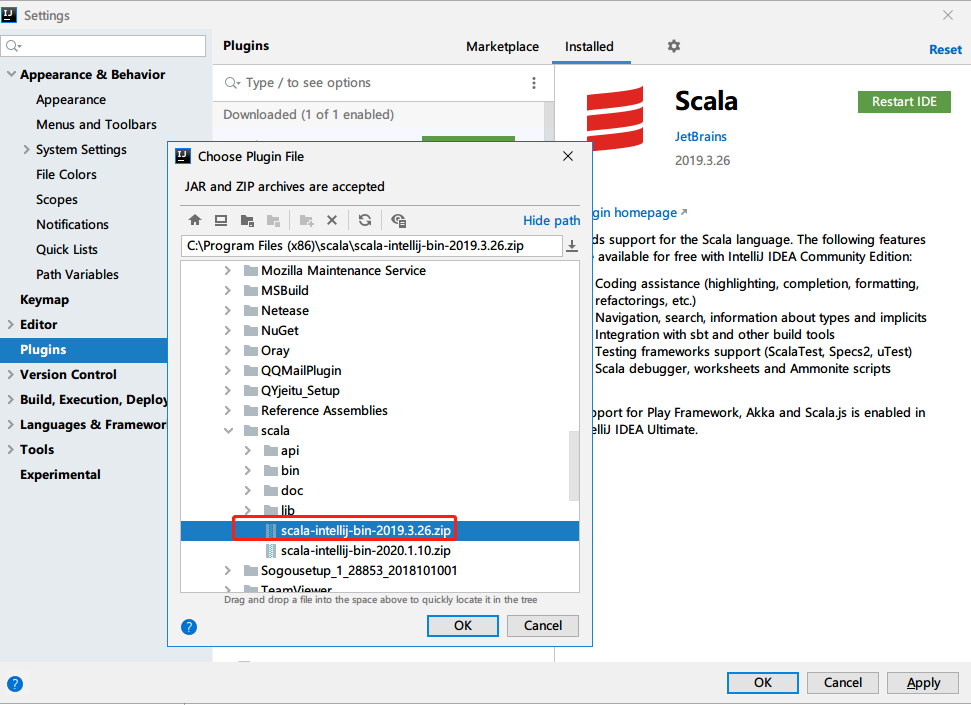 直接选择zip的压缩包,点击OK,会显示 INSTALL,安装后,会变成 Restart IDE,然后点击此按钮重启IDE,然后在 新建项目的时候,就能创建Scala项目了。