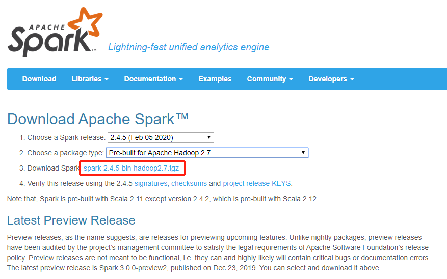 下载的版本是可以选择的,另外Spark对应的Hadoop版本兼容也能直接体现出来。我这里使用的是2.4.5版本的spark