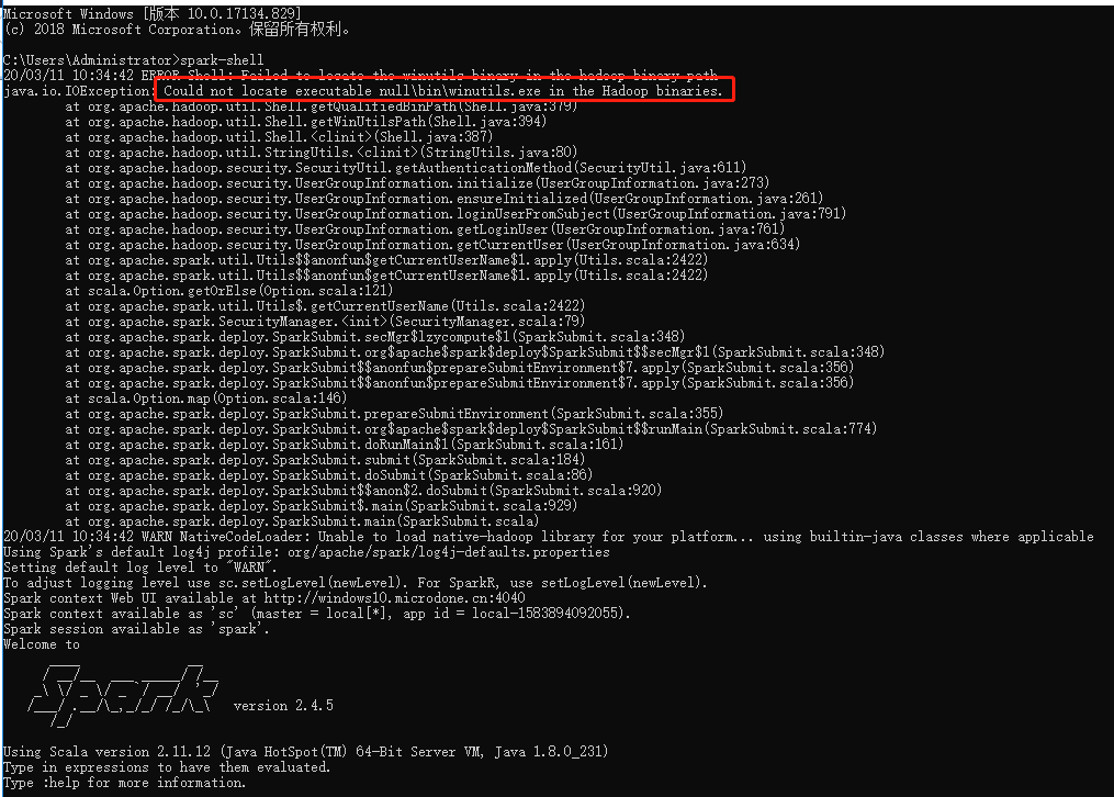 此时我们回到我们在运行spark-shell 会报错的情况,当时我们认为是没有安装 Hadoop导致的,那么我们接着测试一下会发现仍旧报错。