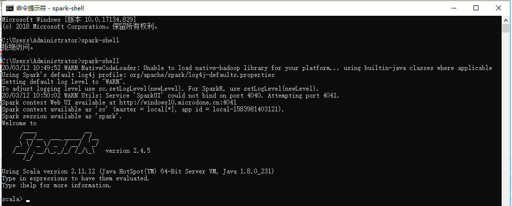 3、在控制台输入spark-shell命令执行安装(建议以管理员身份运行cmd命令行,我遇到一个拒绝访问的问题)