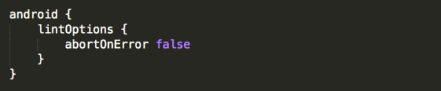 lint会按默认选项会做严格检查,遇到包错误会终止构建过程,可以用如下开关关掉这个选项,不过最好是重视下lint的输出,有问题及时修复,避免潜在问题