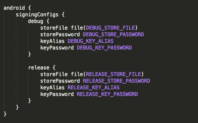 签名信息属于敏感信息,建议不要写死放到gradle脚本中,而是写到一个单独的配置文件里,而且这个配置文件不要同步到版本管理系统上,而是由本地维护,防止在版本管理平台上泄漏敏感信息。建议签名信息内容写到gradle.properties或者local.properties文件里,这样,gradle脚本可以直接引用,如果是放在一个自定义的文件中,gradle脚本需要提供相应的代码来读取文件的内容。