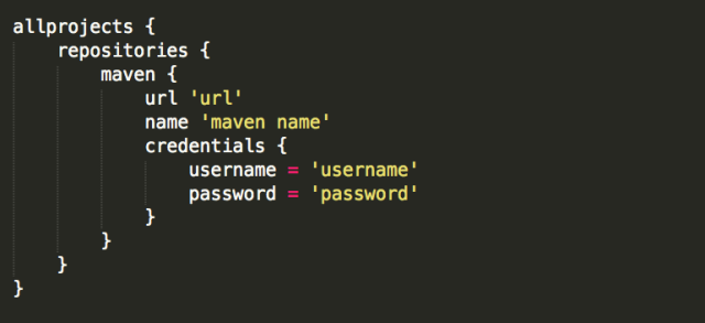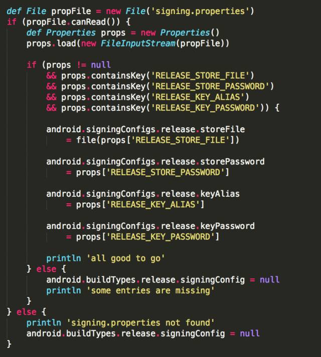 如果签名信息没有放到gradle.properties或者local.properties文件里,那就需要自己写代码读取咯,假设签名信息放在signing.properties文件中, 文件内容可以参考上面,读取文件的代码放入gradle脚本中就可以了,参考代码如下