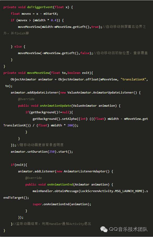 其中,mStartX记录滑动操作起始的x坐标,handleMoveView方法控制mMoveView随手指的移动,doTriggerEvent处理手指离开后mMoveView的移动动画。两个方法的定义如下: