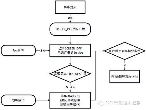 Android系统实现自定义锁屏页的思路很简单,即在App启动时开启一个service,在Service中时刻监听系统SCREEN_OFF的广播,当屏幕熄灭时,Service监听到广播,开启一个锁屏页Activity在屏幕最上层显示,该Activity创建的同时会去掉系统锁屏(当然如果有密码是禁不掉的)。示意图如下: