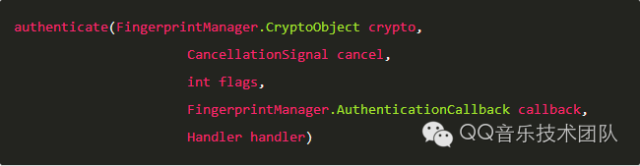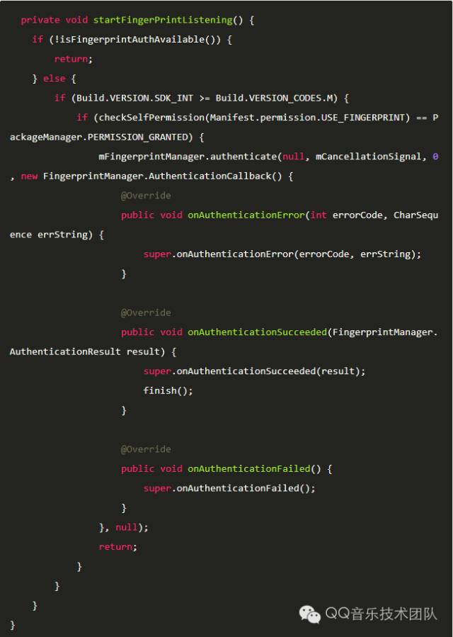 其中,crypto参数代表Android6.0中crypto objects的wrapper class,可以通过该对象使authenticate过程更加安全,也可以不使用,这里我们将其设为null;cancel用来取消anthenticate(),我们new出一个对象传入就可以;flags是标志位,设置为0;callback为指纹识别回调,包含指纹识别的核心方法:onAuthenticationError()是指纹匹配连续失败后的回调(几十秒后才能继续匹配),onAuthenticationSucceeded()是指纹匹配成功的回调,onAuthenticationFailed()是指纹匹配失败时的回调。我们在这几个方法中做相应的处理即可,在onAuthenticationSucceeded()方法中调用finish(),就能够在指纹识别成功后关闭Activity。
