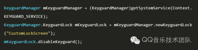 其中,KeyguardManager是锁屏管理类,我们通过getSystemService()的方式获取实例对象mKeyguardManager,调用该对象的newKeyguardLock()方法获取KeyguardManager的内部类KeyguardLock的实例mKeyguardLock,该方法传入的字符串参数用于标识是谁隐藏了系统锁屏,最后调用mKeyguardLock的disableKeyguard()方法可以取消系统锁屏。
