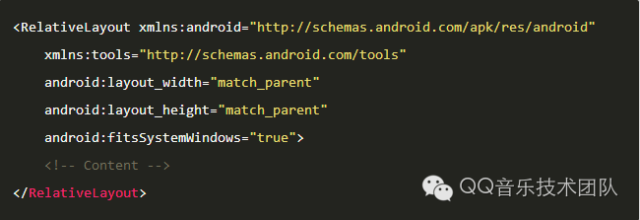此外,有个部份要稍微留意一下,如果不希望界面的内容被上拉到状态栏(Status bar)的话,要记得在界面(Layout)XML文件中,在最外层Layout中将fitsSystemWindows属性设置为true。如下: