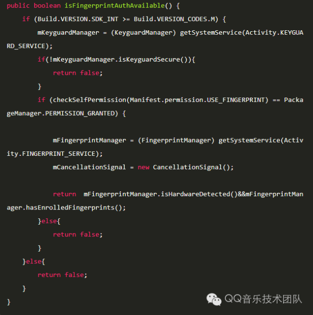 在调用指纹识别功能之前,我们需要判断指纹识别功能是否可用,以及APP是否有相应的权限。这一过程体现在isFingerprintAuthAvailable()中,第一步是获取KeyguardManager对象,调用isKeyguardSecure()判断是否设置有锁屏密码,如果有,则需进一步判断。checkSelfPermission用来判断APP是否有指纹识别的权限(SDK 23要求),如果有则获取FingerprintManager对象,调用该对象的isHardwareDetected()方法判断指纹识别硬件是否可用,调用hasEnrolledFingerprints()判断是否有事先录入好的指纹,只有以上条件都满足,接下来才能调用指纹识别功能。