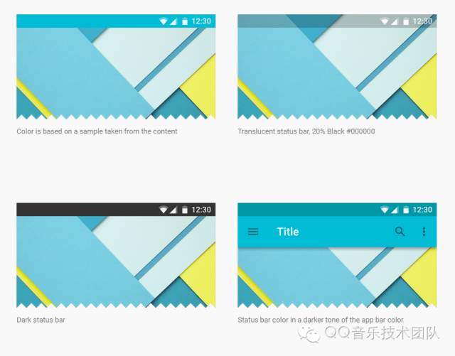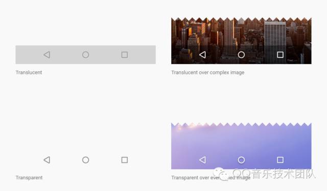 在 Android 5.0 之后引入了 Material Design,状态栏和导航栏也玩出了更多花样。现在除了原有的“半透明”模式以外,还有“全透明”以及“变色”模式,一种会完全隐藏背景,另一种可以取色作为背景颜色,多种样式的透明栏如下图(上图为透明状态栏,下图为透明导航栏):