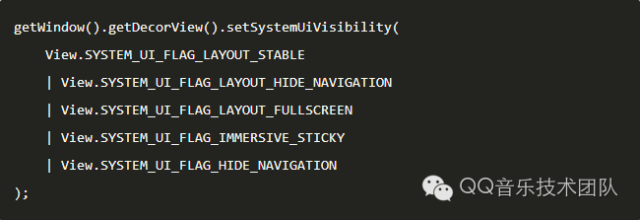 总共用到了5个Flag:SYSTEM_UI_FLAG_LAYOUT_STABLE保持整个View稳定,使View不会因为SystemUI的变化而做layout;SYSTEM_UI_FLAG_IMMERSIVE_STIKY,能够在隐藏的bar被呼出时(比如从屏幕下边缘开始向上做滑动手势),使bar在无相关操作的情况下自动再次隐藏;对于SYSTEM_UI_FLAG_LAYOUT_HIDE_NAVIGATION,开发者容易被其中的HIDE_NAVIGATION所迷惑,其实这个Flag没有隐藏导航栏的功能,只是控制导航栏浮在屏幕上层,不占据屏幕布局空间;SYSTEM_UI_FLAG_HIDE_NAVIGATION,才是能够隐藏导航栏的Flag;SYSTEM_UI_FLAG_LAYOUT_FULLSCREEN,由上面可知,也不能隐藏状态栏,只是使状态栏浮在屏幕上层。