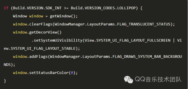 除了要清理掉4.4的FLAG_TRANSLUCENT_STATUS外,还要配合SYSTEM_UI_FLAG_LAYOUT_FULLSCREEN和SYSTEM_UI_FLAG_LAYOUT_STABLE,添加标志位FLAG_DRAWS_SYSTEM_BAR_BACKGROUNDS,并调用setStatusBarColor设置状态栏的颜色为透明。