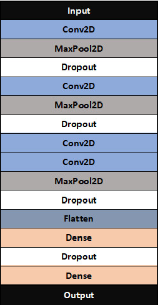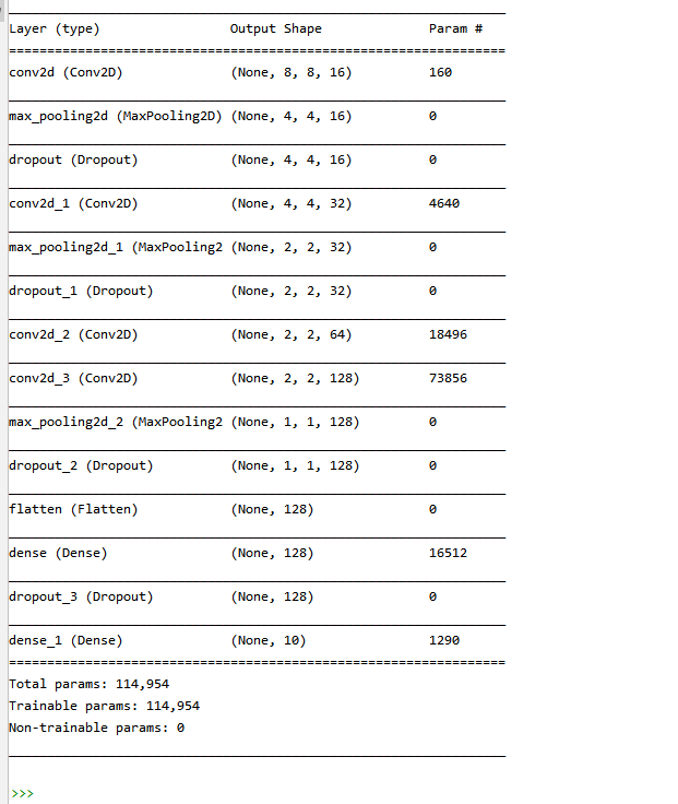 from tensorflow.keras.models import Sequential from tensorflow.keras.layers import Dense, Dropout, Flatten, Conv2D, MaxPool2D # 建立模型 model = Sequential() ks = (3, 3) # 卷积核的大小 input_shape = X_train.shape[1:] # 一层卷积,padding='same',tensorflow会对输入自动补0 model.add(Conv2D(filters=16, kernel_size=ks, padding='same', input_shape=input_shape,activation='relu')) # 第一层输入数据的shape要指定外,其他层的数据的shape框架会自动推导 # 池化层1 model.add(MaxPool2D(pool_size=(2, 2))) # 防止过拟合,随机丢掉连接 model.add(Dropout(0.25)) # 二层卷积 model.add(Conv2D(filters=32, kernel_size=ks, padding='same', activation='relu')) # 池化层2 model.add(MaxPool2D(pool_size=(2, 2))) model.add(Dropout(0.25)) # 三层卷积 model.add(Conv2D(filters=64, kernel_size=ks, padding='same', activation='relu')) # 四层卷积 model.add(Conv2D(filters=128, kernel_size=ks, padding='same', activation='relu')) # 池化层3 model.add(MaxPool2D(pool_size=(2, 2))) model.add(Dropout(0.25)) # 平坦层 model.add(Flatten()) # 全连接层 model.add(Dense(128, activation='relu')) model.add(Dropout(0.25)) # 激活函数softmax model.add(Dense(10, activation='softmax')) model.summary()
