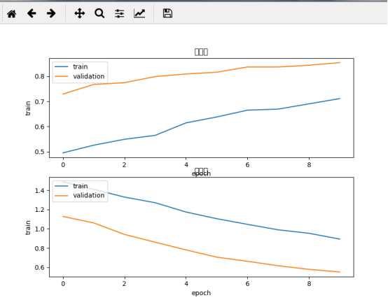 model.compile(loss='categorical_crossentropy', optimizer='adam', metrics=['accuracy']) train_history = model.fit(x=X_train, y=Y_train, validation_split=0.2, batch_size=300, epochs=10, verbose=2) score = model.evaluate(X_test, Y_test) score import matplotlib.pyplot as plt def show_train_history(train_history, train, validation): plt.plot(train_history.history[train]) plt.plot(train_history.history[validation]) plt.title('Train History') plt.ylabel('train') plt.xlabel('epoch') plt.legend(['train', 'validation'], loc='upper left') plt.show() p = plt.figure(figsize=(15, 15)) a1 = p.add_subplot(2, 1, 1) show_train_history(train_history, 'accuracy', 'val_accuracy') plt.title("准确率") a2 = p.add_subplot(2, 1, 2) show_train_history(train_history, 'loss', 'val_loss') plt.title("损失率") plt.show()