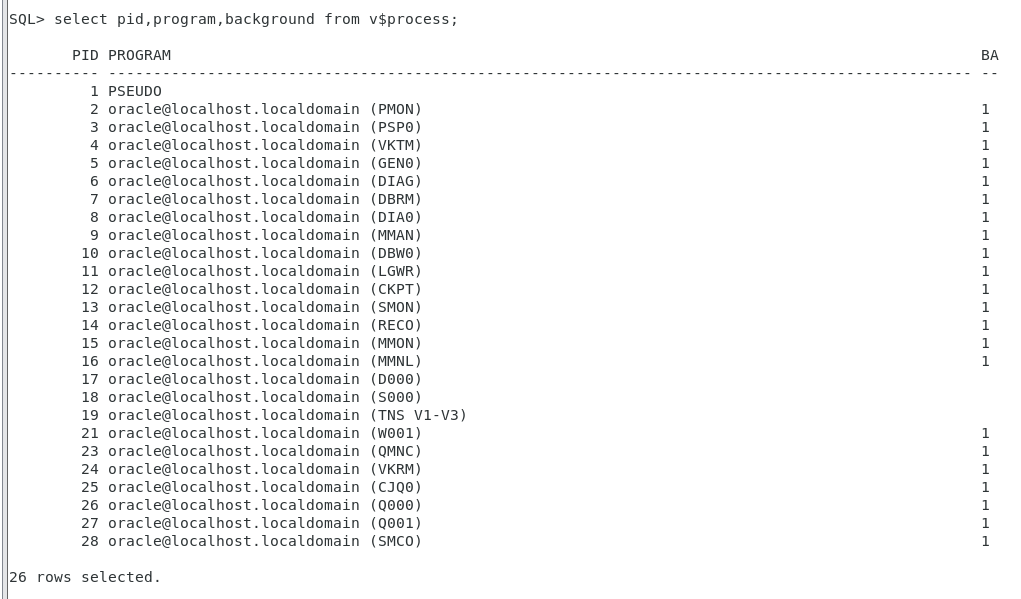 命令:select pid,program,background from v$process;