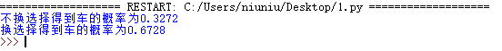 import random n=random.randint(5000,10000) change=0 nochange=0 for i in range(1,n+1): a=random.randrange(0,3) b=random.randrange(1,3) if a==b: nochange=nochange+1 else: change=change+1 print("不换选择得到车的概率为{:.4f}".format(nochange/n)) print("换选择得到车的概率为{:.4f}".format(change/n))