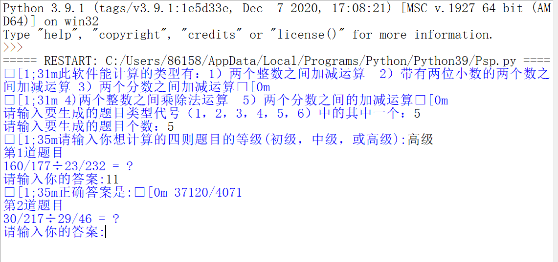 import random from fractions import Fraction #主干函数 def useAnsult(): print("\033[1;31m此软件能计算的类型有:1)两个整数之间加减运算 2)带有两位小数的两个数之间加减运算 3)两个分数之间加减运算\033[0m") print("\033[1;31m 4)两个整数之间乘除法运算 5)两个分数之间的加减运算\033[0m") homeworkType=int(input("请输入要生成的题目类型代号(1,2,3,4,5,6)中的其中一个:")) homeworkCount=int(input("请输入要生成的题目个数:")) level=input("\033[1;35m请输入你想计算的四则题目的等级(初级,中级,或高级):") if level=="初级": level=20 elif level=="中级": level=50 else: level=300 count=0 while count< homeworkCount: if homeworkType==1: count=count+1 print("第"+str(count)+"道题目") intAddSub(level) elif homeworkType==2: count=count+1 print("第"+str(count)+"道题目") decAddSub(level) elif homeworkType==3: count=count+1 print("第"+str(count)+"道题目") proFraAddSub(level) elif homeworkType==4: count=count+1 print("第"+str(count)+"道题目") intMulDiv(level) elif homeworkType==5: count=count+1 print("第"+str(count)+"道题目") proFraMulDiv(level) else: homeworkType=input("\033[1;35m没有该题目类型,输入错误,请重新输入:\033[0m") def intAddSub(level): typeCh=random.randint(0,1) #选择加减运算符 left=random.randint(0,level) #生成随机整数 right=random.randint(0,level) if typeCh==0: #加法运算 print(str(left)+"+"+str(right)+"= ?") input("请输入你的答案:") print("\033[1;35m正确答案是:\033[0m",str(left+right)) else: #减法运算 if left< right: #确保减法的结果不会出现负数 middleVariable=left left=right right= middleVariable print(str(left)+"-"+str(right)+" = ?") input("请输入你的答案:") print("\033[1;35m正确答案是:\033[0m",str(left-right)) def decAddSub(level): left = random.uniform(0, level) left=round(left, 2) #生成的随机数保留两位小数 right = random.uniform(0, level) right=round(right, 2) typeCh=random.randint(0,1) #选择加减运算符 if typeCh==0: #加法运算 print(str(left)+"+"+str(right)+"= ?") input("请输入你的答案:") print("\033[1;35m正确答案是:{:.2f}\033[0m".format(left+right)) else: #减法运算 if left< right: #确保减法的结果不会出现负数 middleVariable=left left=right right= middleVariable print(str(left)+"-"+str(right)+" = ?") input("请输入你的答案:") print("\033[1;35m正确答案是:{:.2f}\033[0m".format(left-right)) def proFraAddSub(level): number1=random.randint(0,level) number11=random.randint(1,level) left=Fraction(number1,number11 ) number2=random.randint(0,level) number22=random.randint(1,level) right=Fraction(number2,number22) typeCh=random.randint(0,1) #选择加减运算符 if typeCh==0: #加法运算 print(str(left)+"+"+str(right)+"= ?") input("请输入你的答案:") print("\033[1;35m正确答案是:\033[0m",str(Fraction(left+right))) else: #减法运算 if left< right: #确保减法的结果不会出现负数 middleVariable=left left=right right= middleVariable print(str(left)+"-"+str(right)+" = ?") input("请输入你的答案:") print("\033[1;35m正确答案是:\033[0m",str(Fraction(left-right))) #两个整数之间乘除运算 def intMulDiv(level): typeCh=random.randint(0,1) #选择运乘除算符 if typeCh==0: #乘法 left=random.randint(0,level) right=random.randint(0,level) print(str(left)+"*"+str(right)+"= ?") input("请输入你的答案:") print("\033[1;35m正确答案是:\033[0m",str(left*right)) else: #除法 if level<300: right=random.randint(1,level) left=right*random.randint(0,4) #此处考虑到用户如果选择初级或中级的除法计算,计算结果是整数比较好,故设除数是被除数的倍数 else: left=random.randint(1,level) right=random.randint(1,level) print(str(left)+"÷"+str(right)+" = ?") input("请输入你的答案:") if left%right==0: #判断是否能整除 print("\033[1;35m正确答案是:\033[0m",str(int(left/right))) else: print("\033[1;35m正确答案是:\033[0m",str(Fraction(left,right))) def proFraMulDiv(level): number1=random.randint(0,level) number11=random.randint(1,level) left=Fraction(number1,number11 ) typeCh=random.randint(0,1) #选择乘除运算符 if typeCh==0: #乘法运算 number2=random.randint(0,level) number22=random.randint(1,level) right=Fraction(number2,number22) print(str(left)+"*"+str(right)+"= ?") input("请输入你的答案:") print("\033[1;35m正确答案是:\033[0m",str(left*right)) else: #除法运算 number2=random.randint(1,level) number22=random.randint(1,level) right=Fraction(number2,number22) print(str(left)+"÷"+str(right)+" = ?") input("请输入你的答案:") print("\033[1;35m正确答案是:\033[0m",str(Fraction(left,right))) useAnsult()