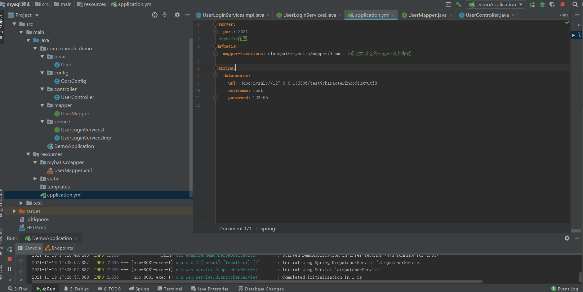 server: port: 8081 #mybatis配置 mybatis: mapper-locations: classpath:mybatis/mapper/*.xml #修改为对应的mapper文件路径 spring: datasource: url: jdbc:mysql://127.0.0.1:3306/test?characterEncoding=utf8 username: root password: 123456