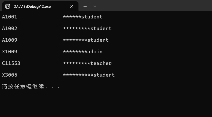 void output(Account x[], int n); // 输出账户数组x中n个账户信息。其中,密码用"*"替代显示