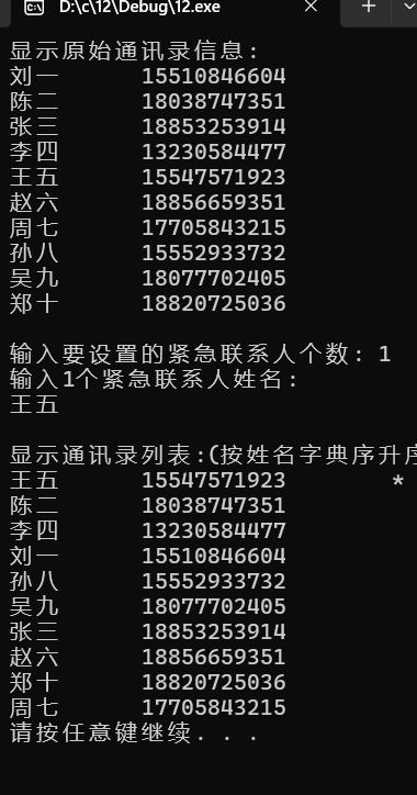 void display(Contact x[], int n); // 按联系人姓名字典序升序显示信息,紧急联系人最先显示