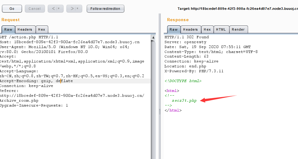 发现它是end.php也就是说,在action.php那里直接进行了跳转。那我们不妨用bp抓一波包,逐步运行,来查看一波action.php里到底有啥