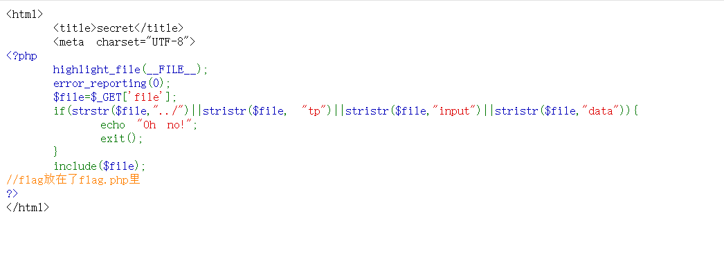 虽然没有直接获得flag,但是知道了flag在哪个目录中。再返回查看源码,其实此时可以猜到这道题考的就是一个文件包含了