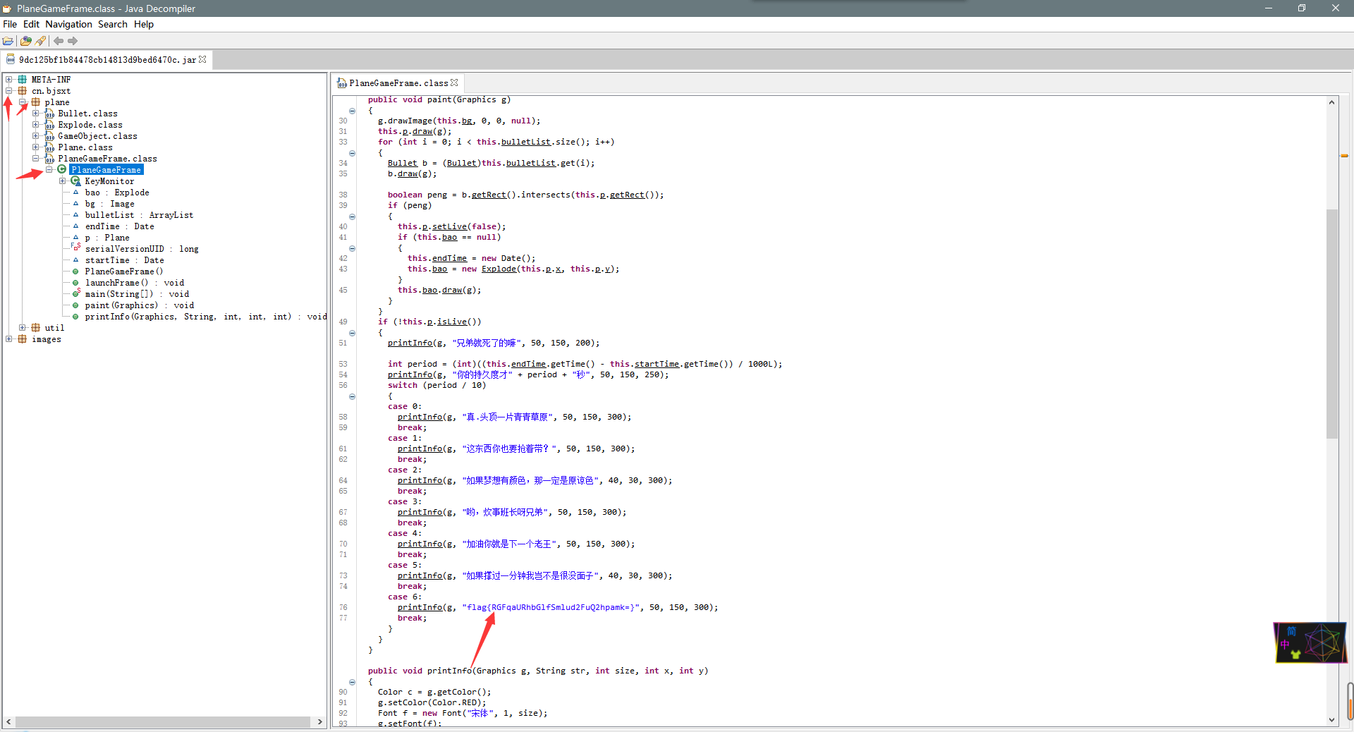 打开后发现是个游戏,,如果你有那个耐心,你可以自己玩60秒,不过不是很容易,(这里有个坑,就是你把界面放大后,你可以移动到空白处,,但是你就出不来了,人家要求是刚刚好60秒),这里我们选择逆向。方式很多,,可以直接分解出压缩包用idea看,我这里用了一个直接java的反编译工具 java decompiler