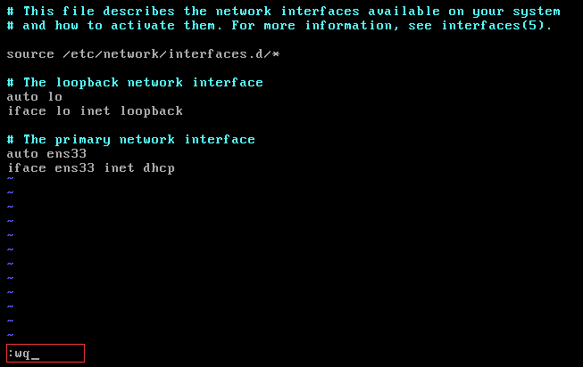 使用vim编辑器,去修改/etc/network/interfaces 文件中的数据(如图输入)