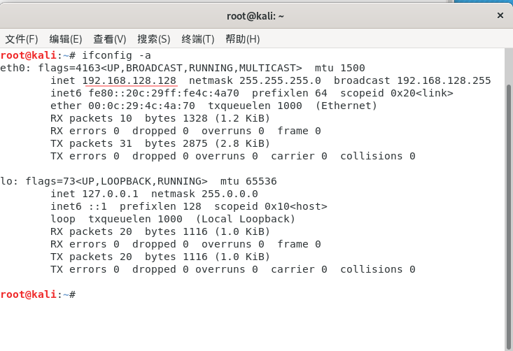 先ifconfig -a 一下,看一下你kali的IP地址,因为我们是在局域网内进行的哈。