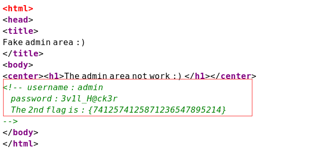这提示是不是有点点此地无银三百两的感觉,特别是最后那个笑脸,无时无刻不提醒着你,此事必有蹊跷。作为一个web题,最不能忘得是啥,那就是看源码呀,查看源码后,果真有惊喜,不仅获得了第二个flag,还得到一组账号密码,不用想也是开始登陆页面的账号密码了,