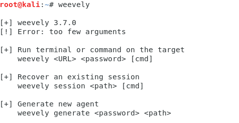 weevely就好像windows上的菜刀,可以进行后门的一个连接。用法你直接在终端输入weevely就会告诉你,很友好哈。