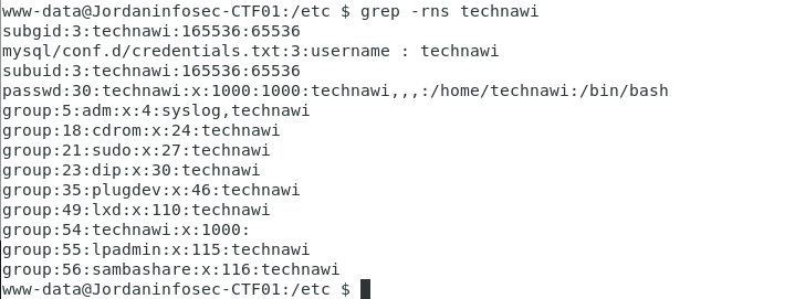第三个flag到手,同时它告诉咱,我们需要使用technawi这个用户才可以阅读flag.txt,那么我们就该去找technawi的密码了呢,他说在一个隐藏的目录,这里我们就要搜索目录,grep这是个很好的东西,但是,确实慢,慢的离谱。别的查找命令,我试了,都找不到。。。我们要回主目录进行搜查,估计这就是它慢的理由吧。。我花了整整16分钟,,所以,,不推荐在主目录。可以自己选择一些关键目录,如etc