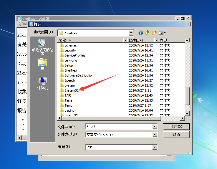 之后,在window目录下,找到system32打开进入,发现满满的文件夹,点击文件类型,选择所有文件。将会看到所有程序
