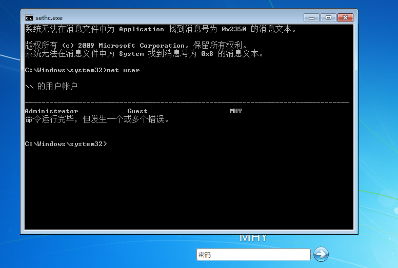 net user一下,看看咱们的用户有啥。我这上面刚刚设密码的时MHY这个账户,所以,改它。(错误可忽略)