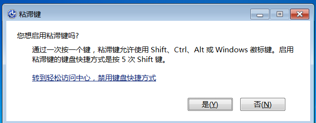 本次实验,选择win7虚拟机进行,也算是对自己学习的这个漏洞的思路的一个记载,方便开拓一种提权思路。前提是,粘滞键处于开启状态哦,即在登录用户页面摁5次shift键,出现下图这么个东东。(其实思路是比较简单的,就是在开机界面通过一些技巧,将粘滞键这个应用名掉包,以cmd这个应用替换掉sethc(即粘滞键),从而在登录界面以system身份打开cmd完成一次提权)
