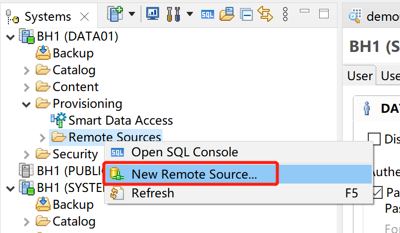 1、打开BH1列表->Provisioning->右击Remote Source->选择New Remote Source