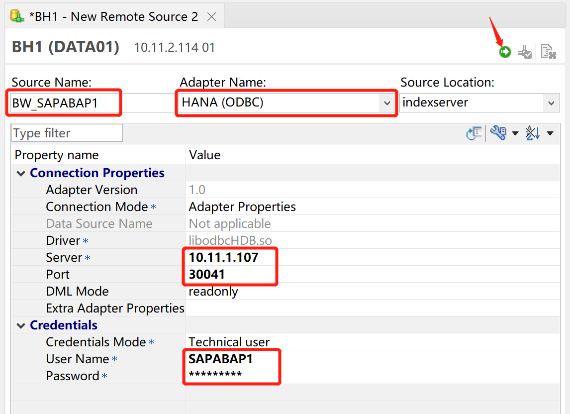 2、填写Source Name,Adapter Name选择HANA(ODBC);填写对应的Server、Port、User Name、Password