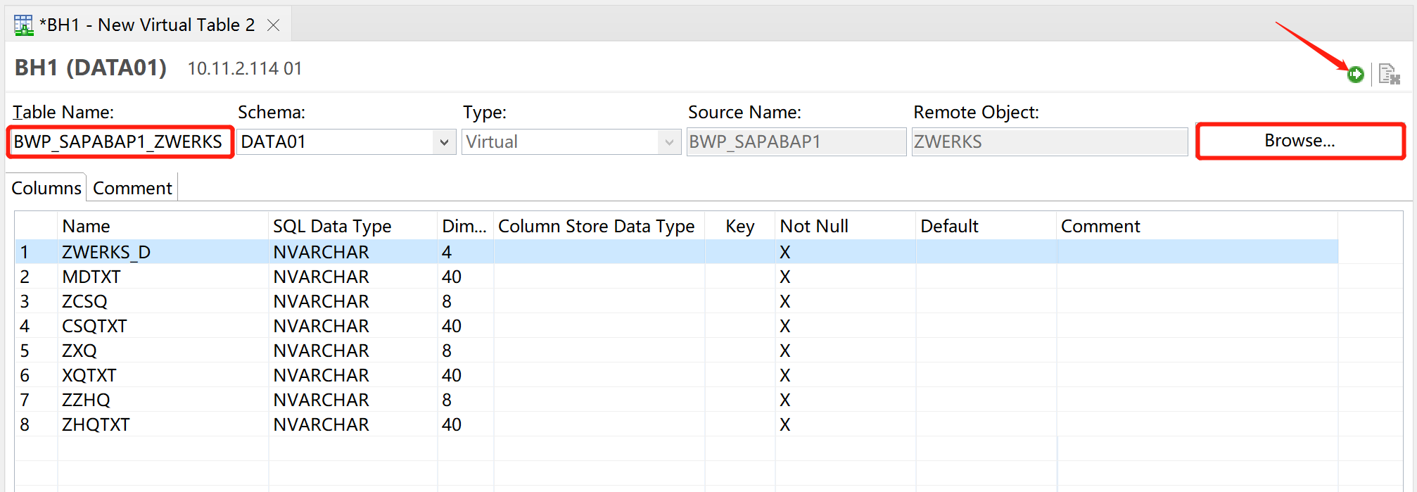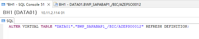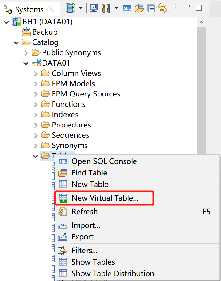 1、打开BH1列表->Catalog->选择对应的Schema->右击Table->选择New Vitual Table
