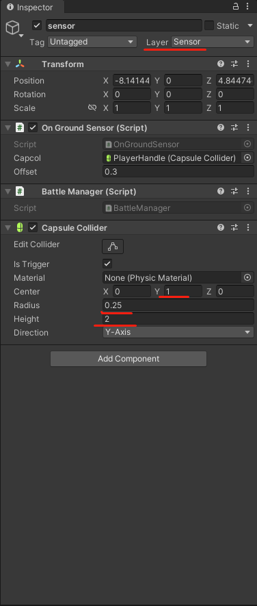 在PlayerHandle里找到sensor,新建一个脚本BattleManager。