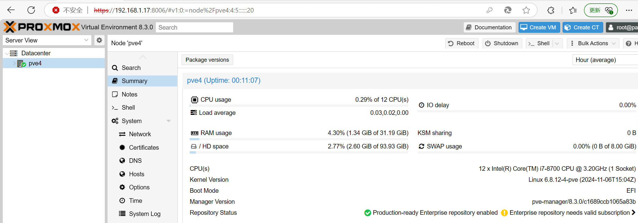 安装完毕后,Proxmox VE 的版本为 8.3.0,如下图。