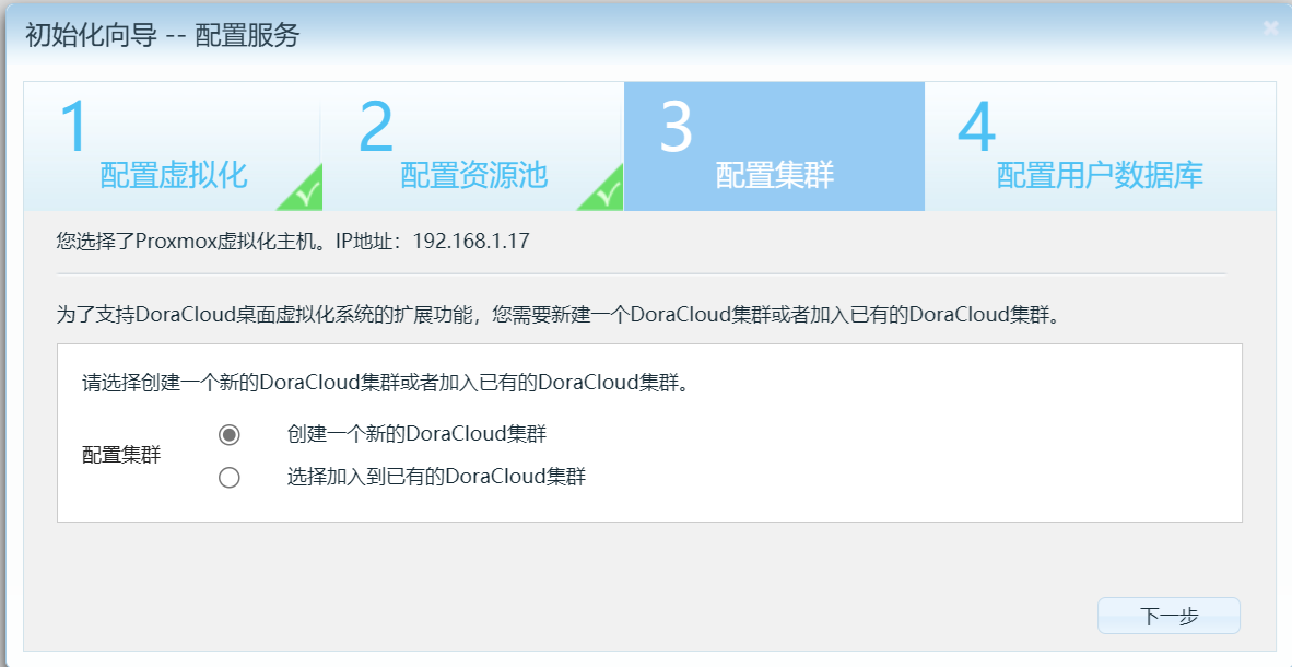 DoraCloud 的后续配置,可以根据向导操作。包括配置 虚拟化、资源池、集群、用户数据库。