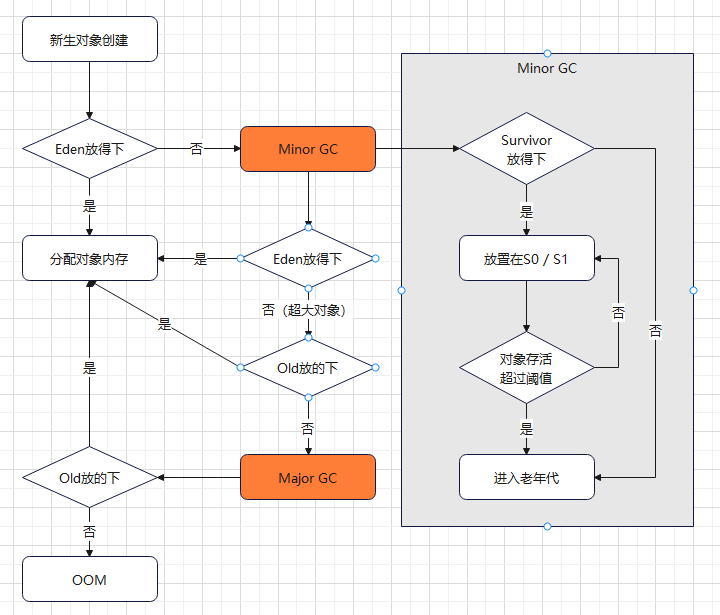 发生条件:Eden区放不下新生对象; GC算法:标记-复制; GC过程:1. 先对Eden区、S0区进行可达性分析,找到活跃对象; 2. 将活跃对象复制到S1区,并将分代年龄+1(如果分代年龄超过15,则直接放入老年代); 3. 清空Eden区、S0区; 4. 交换S1区与S0区; 耗时长的原因:对象生命周期长(静态变量多);缓存使用不当;锁竞争严重(局部变量生命周期变长); |